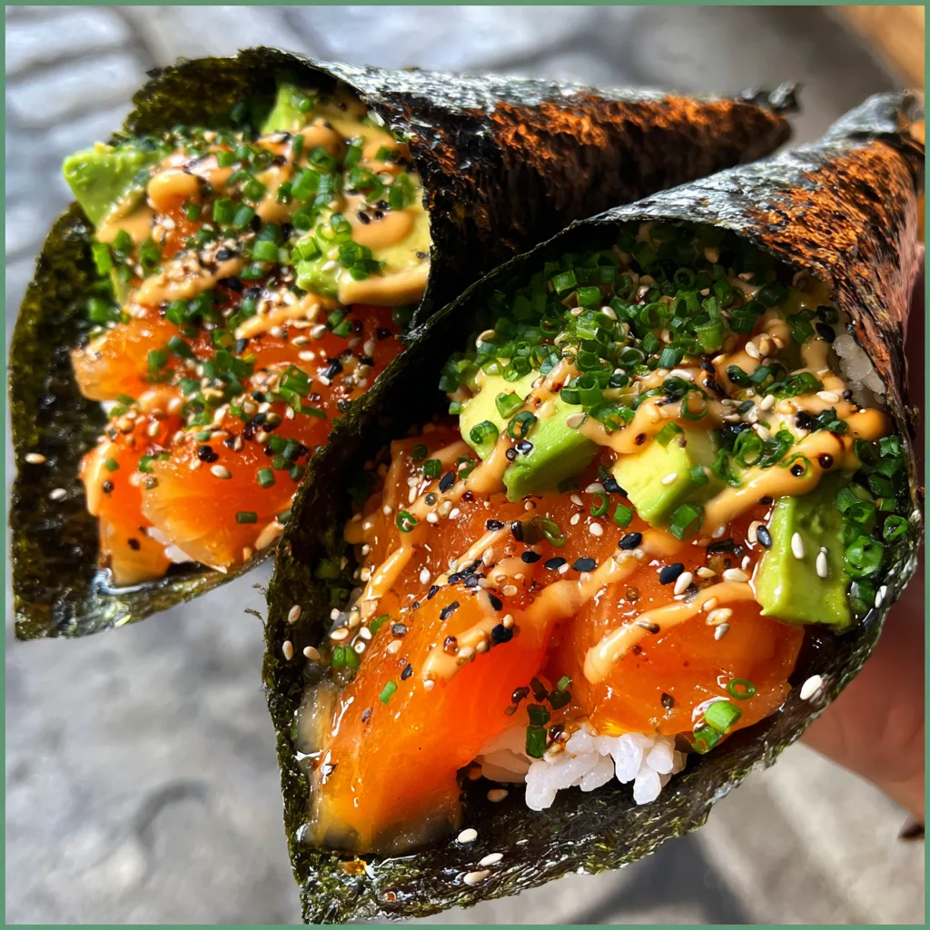 Temaki (literally translating to “hand roll”) is a beloved style of sushi where crisp sheets of nori are wrapped into a cone shape and stuffed with rice, fish, and vegetables. Unlike standard cut rolls, these are meant to be eaten immediately with your hands, while the seaweed is still impossibly crisp and the rice is still slightly warm. The star of this show is the spicy salmon filling—fresh, buttery cubes of sashimi-grade fish tossed in a creamy, fiery sauce that hits every pleasure point on the palate.