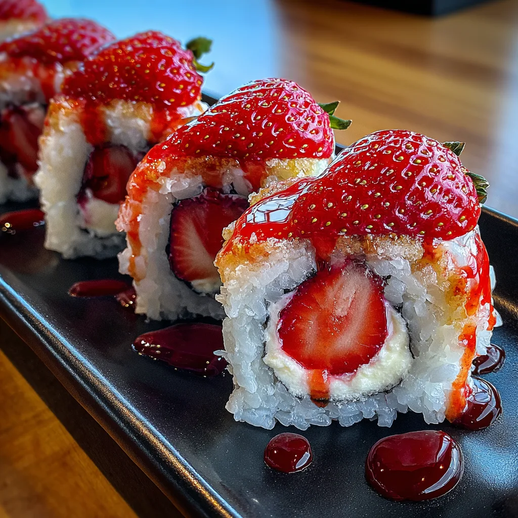 10. Plate and Garnish: Arrange the sliced sushi pieces on a serving platter. Top each piece with a fresh strawberry half. Generously drizzle the glossy strawberry syrup over the top of the rolls, allowing it to pool beautifully on the plate just before serving.
