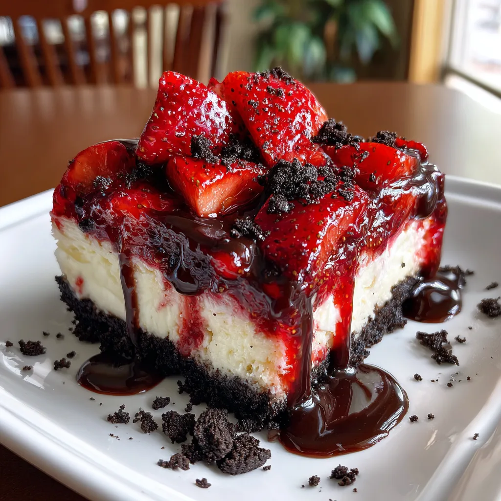 When it comes to creating a dessert that absolutely steals the show, finding the perfect balance of flavors and textures is the ultimate culinary goal. If you are searching for a treat that marries the rich, dark, slightly bitter notes of chocolate with the bright, sweet, and tangy profile of fresh summer fruit, look no further than these incredible Strawberry Oreo Cheesecake Bars. This dessert is a masterclass in contrasting elements: a dense, buttery, crunchy dark chocolate cookie crust sits beneath a layer of cloud-like, velvety cheesecake filling that is generously studded with vibrant chunks of fresh strawberries. As if that wasn’t decadent enough, the entire masterpiece is crowned with more fresh berries, a scattering of crushed cookies, and a glossy drizzle of chocolate syrup.