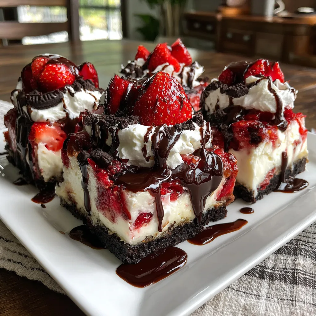 11. 11. Garnish and serve: Once completely chilled, use the parchment paper overhang to lift the entire block out of the pan and onto a cutting board. Spread a thin layer of whipped cream over the top if desired. Decorate generously with the remaining fresh sliced strawberries and chopped Oreo cookies. Finally, finish with a generous, glossy drizzle of chocolate syrup right before slicing into squares. Use a sharp knife, wiping the blade clean with a warm, damp cloth between every single cut for bakery-quality edges.