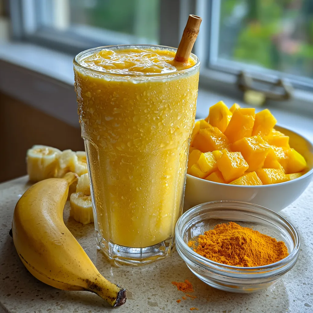 - Gather all ingredients: mango, banana, pineapple, coconut water (or almond milk), and turmeric.