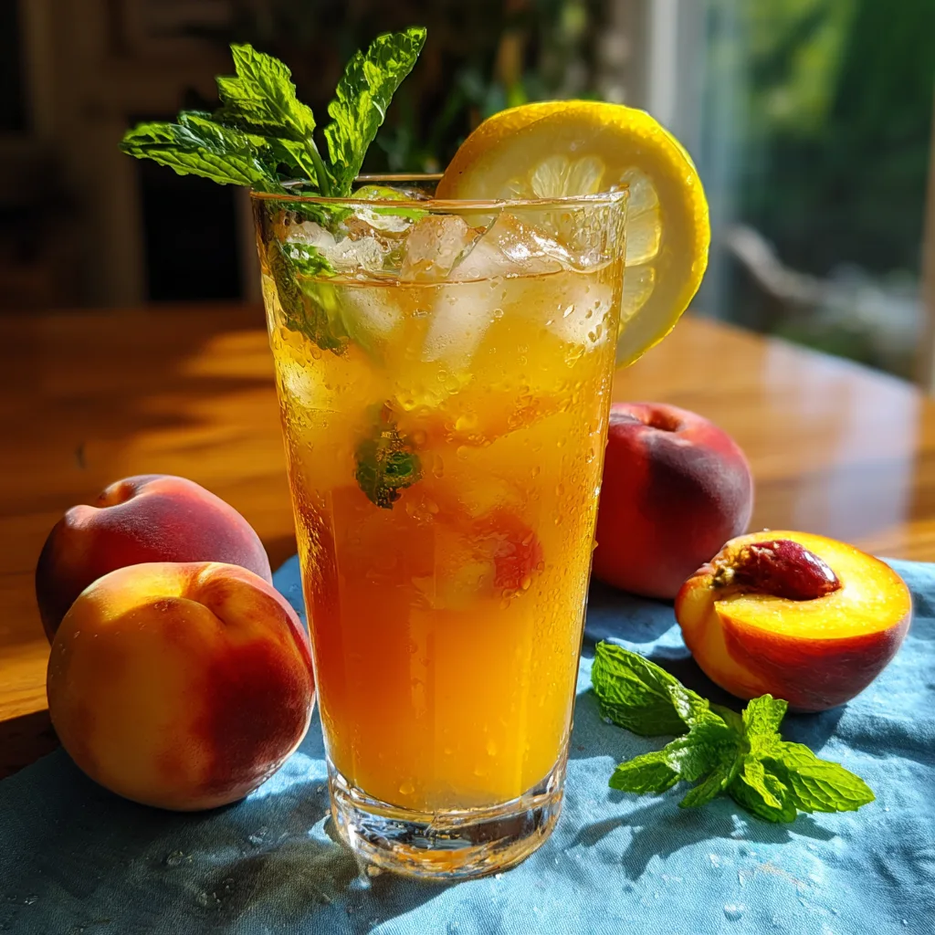 8. Chill and Serve: Refrigerate the pitcher until thoroughly chilled. To serve, fill tall glasses with ice cubes, pour the sweet peach lemonade over the ice, and garnish with fresh mint sprigs, a lemon wheel, and a slice of fresh peach.