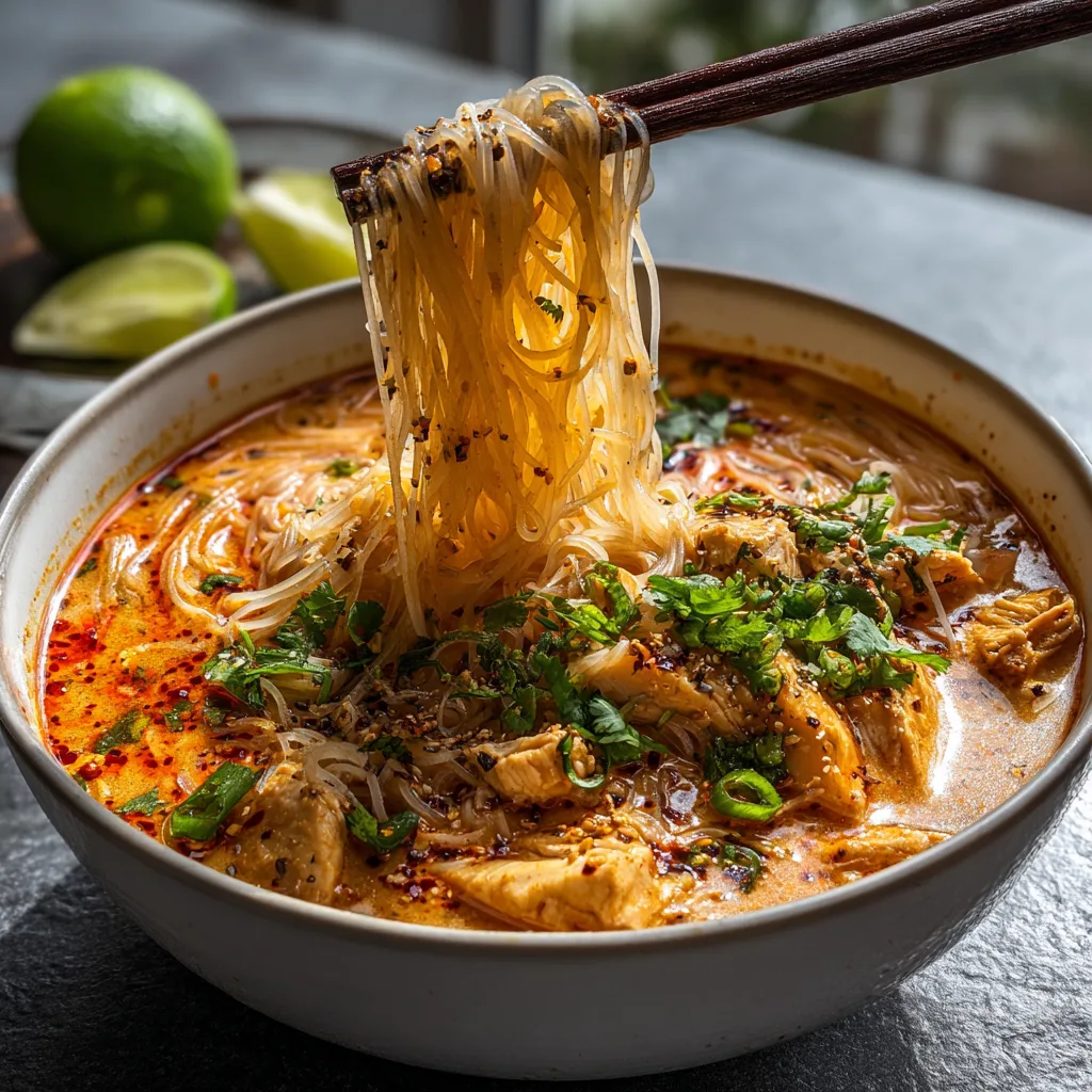 - Assemble and Serve: Divide the prepared rice noodles among serving bowls. Ladle the hot, creamy curry soup and chicken over the noodles. Top generously with the chopped cilantro and sliced green onions. Serve immediately with extra lime wedges on the side.