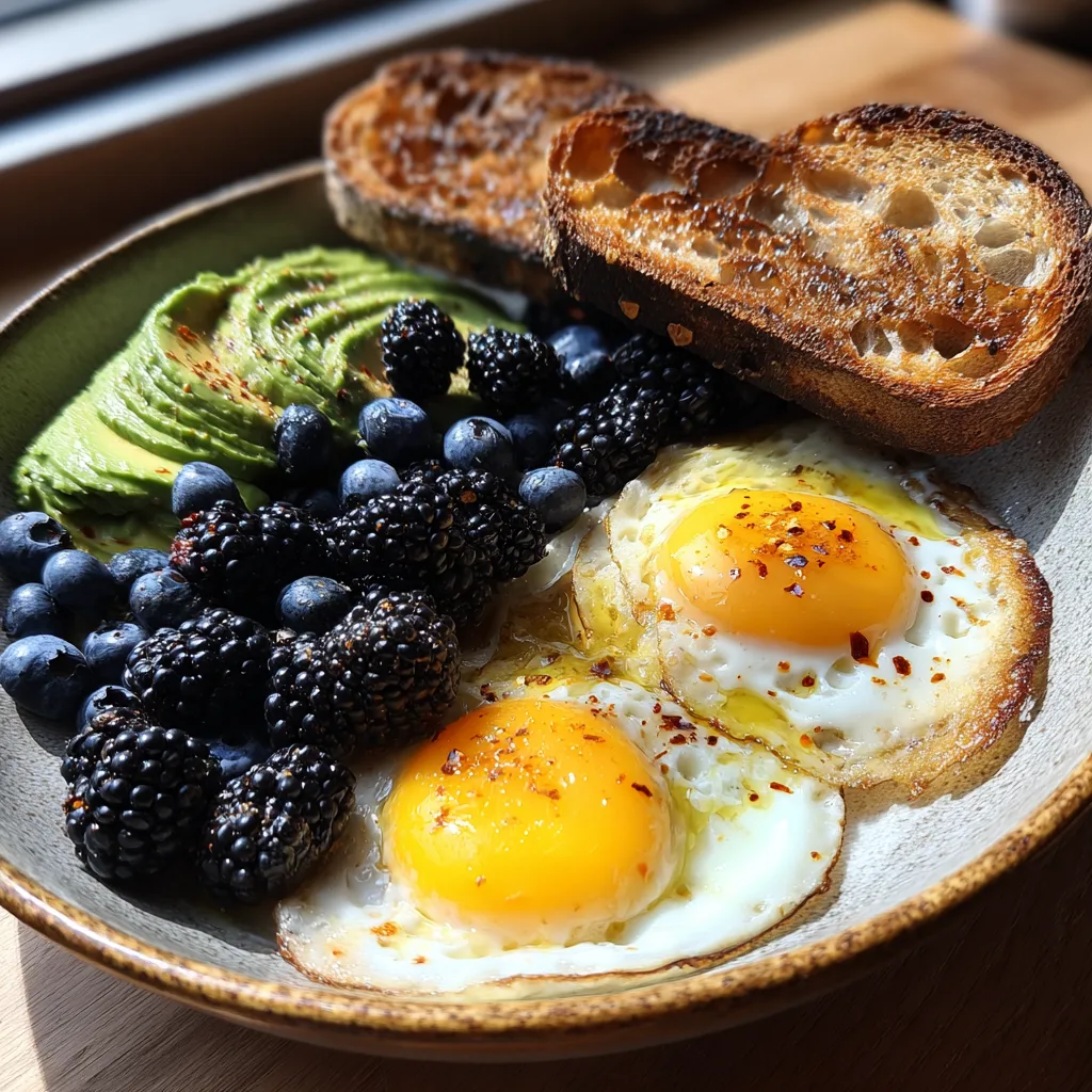 - Assemble the Plate: Place the toast on one side of the plate. Mound the mashed avocado next to it (or spread it on the toast if you prefer). Slide the cooked eggs onto the plate. Pile the fresh berries in the remaining space.