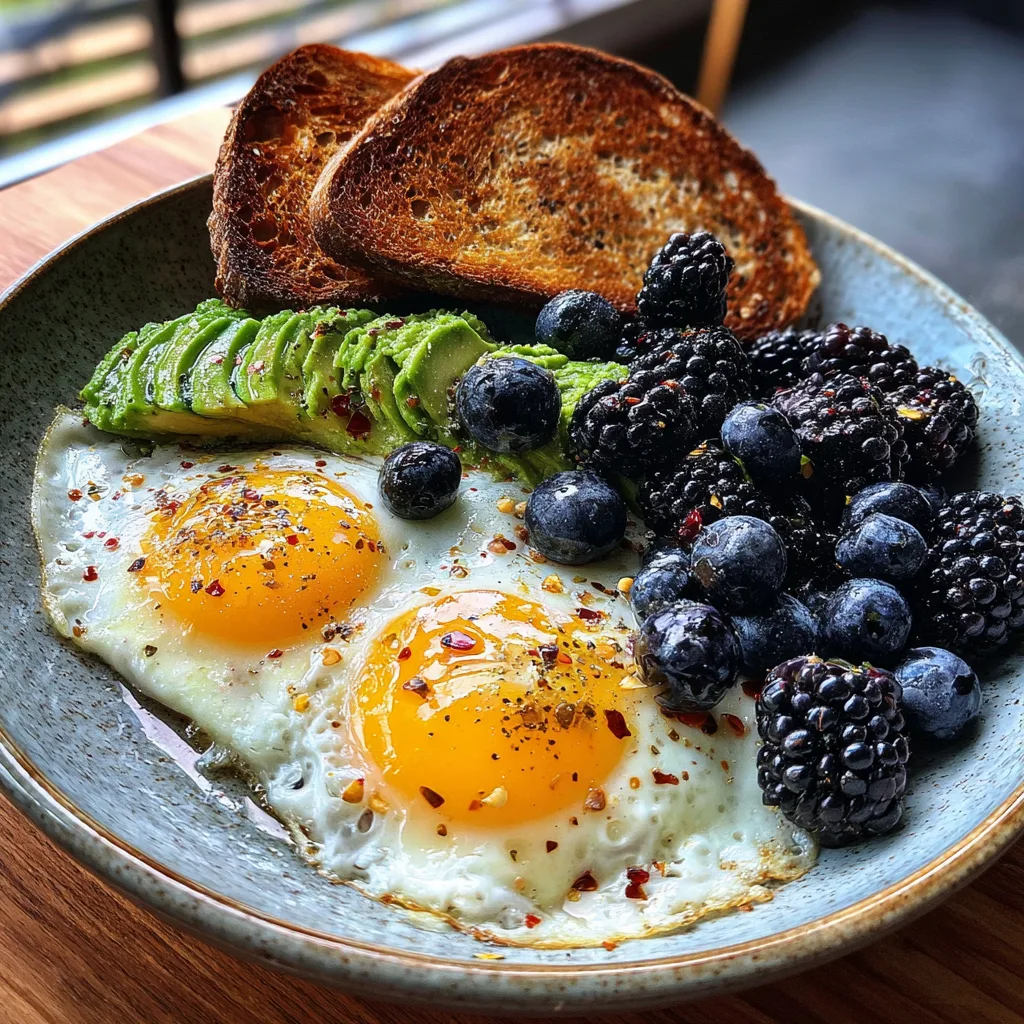 Start your morning with a meal that checks every box: protein-packed, rich in healthy fats, bursting with antioxidants, and incredibly satisfying. This Balanced Breakfast Plate features perfectly fried sunny-side-up eggs, creamy smashed avocado, crunchy rustic sourdough toast, and a refreshing side of fresh berries. It is the definition of a “power breakfast” that keeps you fueled until lunch without the mid-morning crash.
