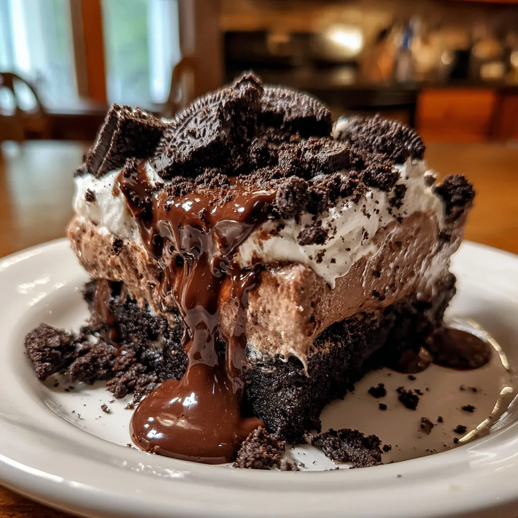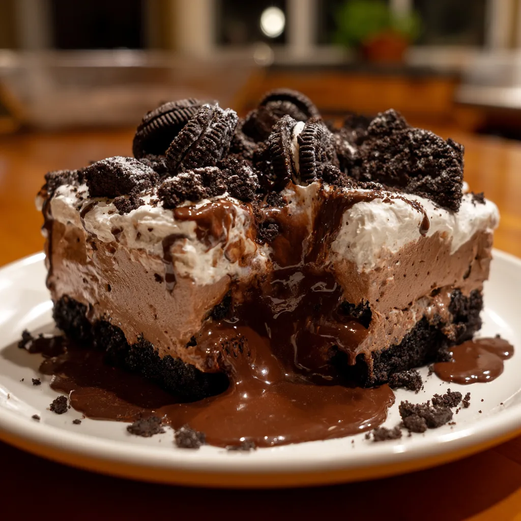 A classic, decadent no-bake dessert featuring layers of crushed Oreo crust, sweetened cream cheese mousse, and rich chocolate pudding. Perfect for parties and potlucks.