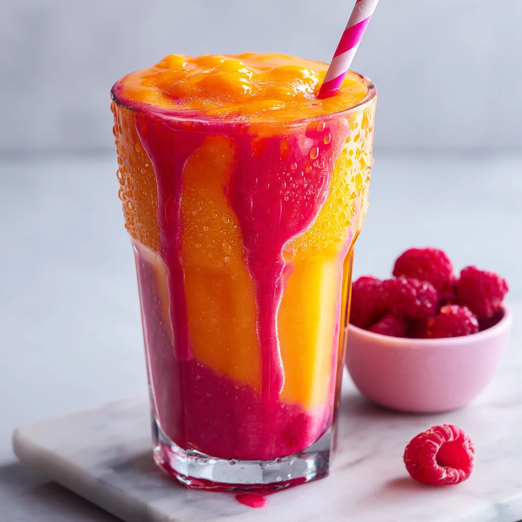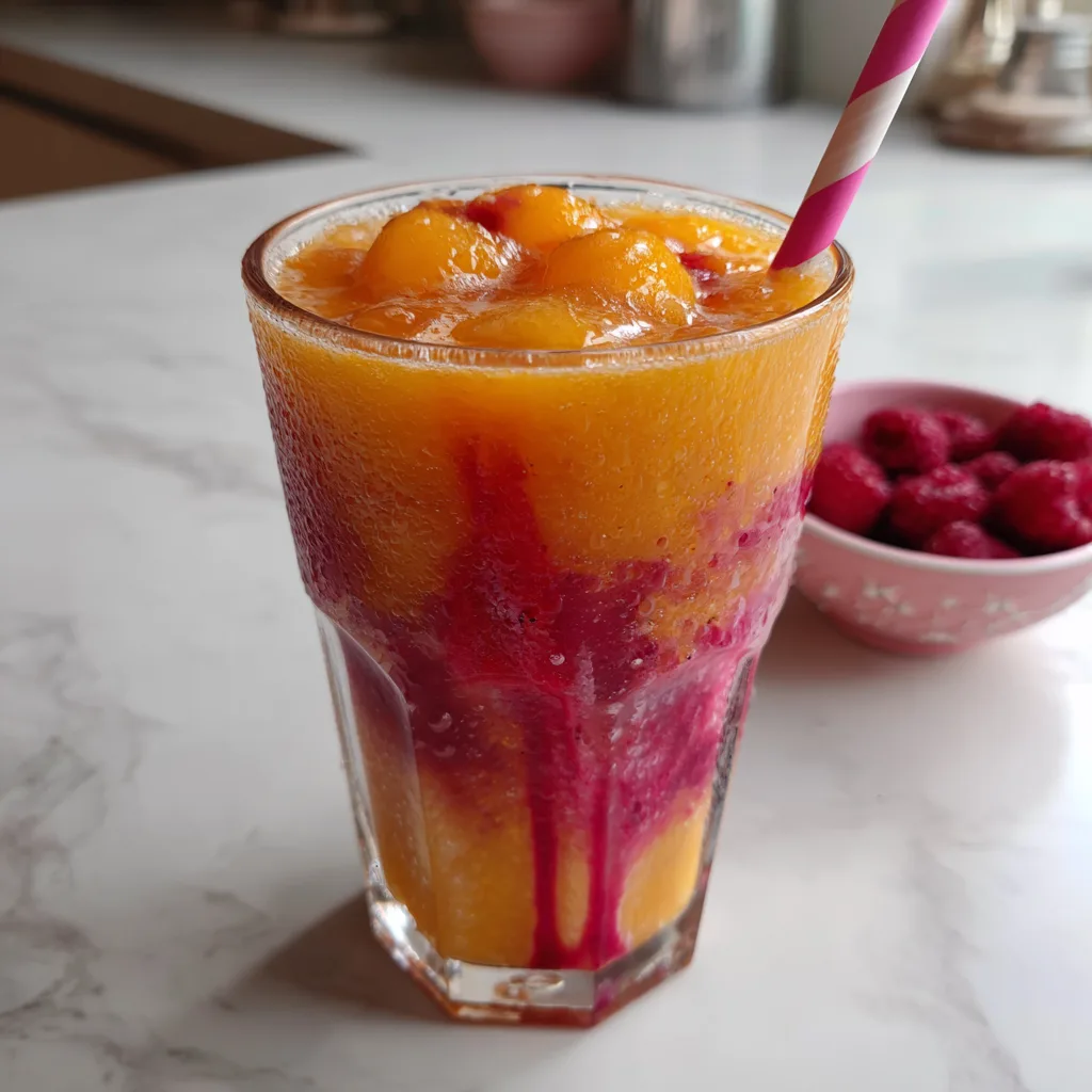 A refreshing and vibrant fruit smoothie blending sweet peaches with tart raspberries and a citrus kick.
