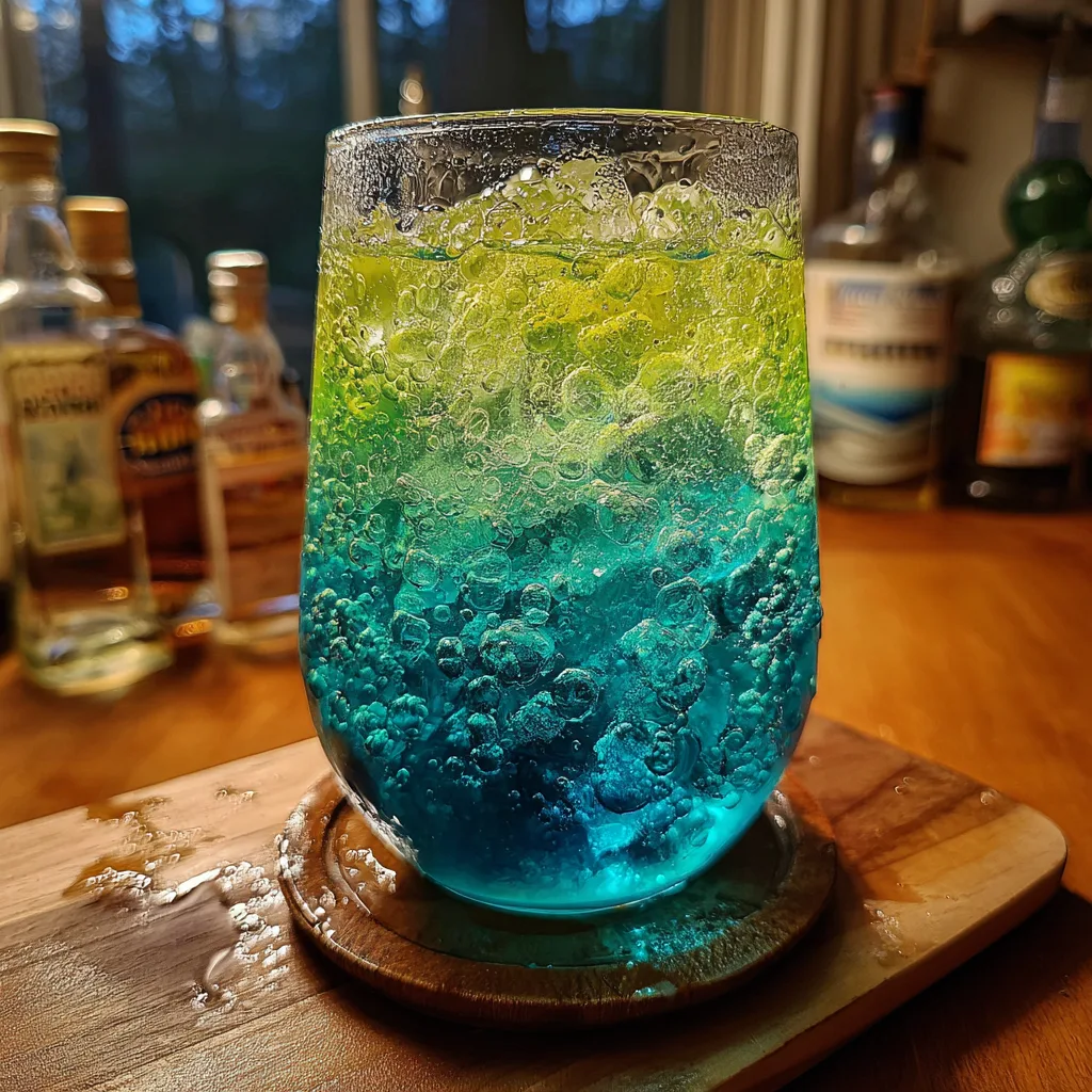 This is the most important step for the visual effect. Slowly pour the Blue Curacao down the inside edge of the glass or over the back of a spoon. Because Blue Curacao is denser (heavier) due to its sugar content, it will sink to the bottom, turning the base of the drink a deep ocean blue while the top remains bright green/yellow.