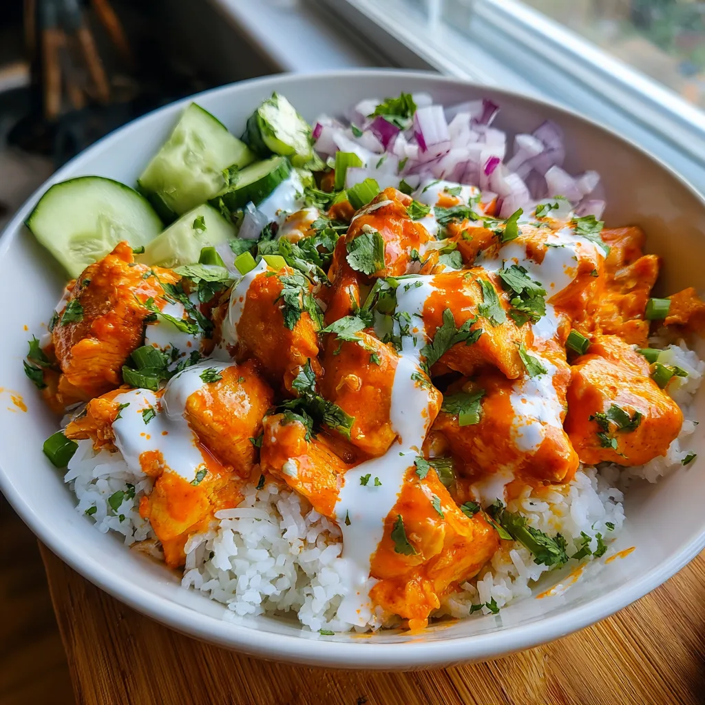 - Assemble bowls with a base of rice, top with buffalo chicken, diced cucumbers, and red onion.