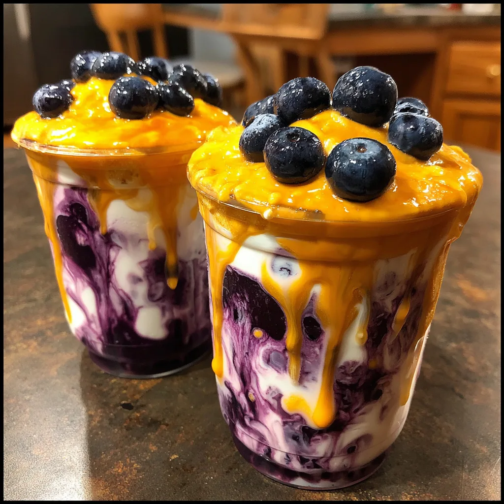 - Gently fold in the blueberries. You can mash some to create a purple swirl effect.