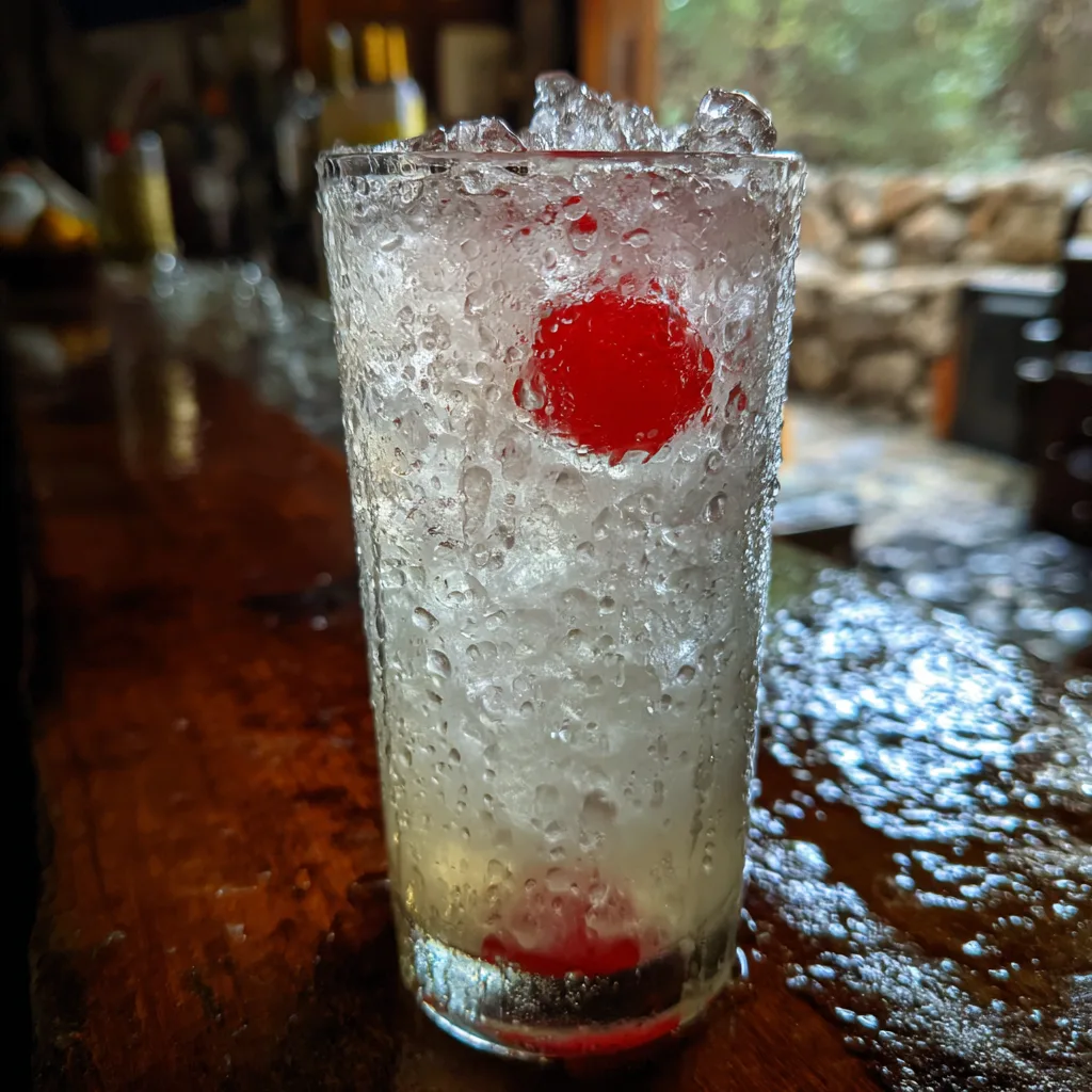 8. Garnish and Serve: Drop a single, bright red maraschino cherry right on top of the ice. Serve immediately while it is ice cold and glistening.